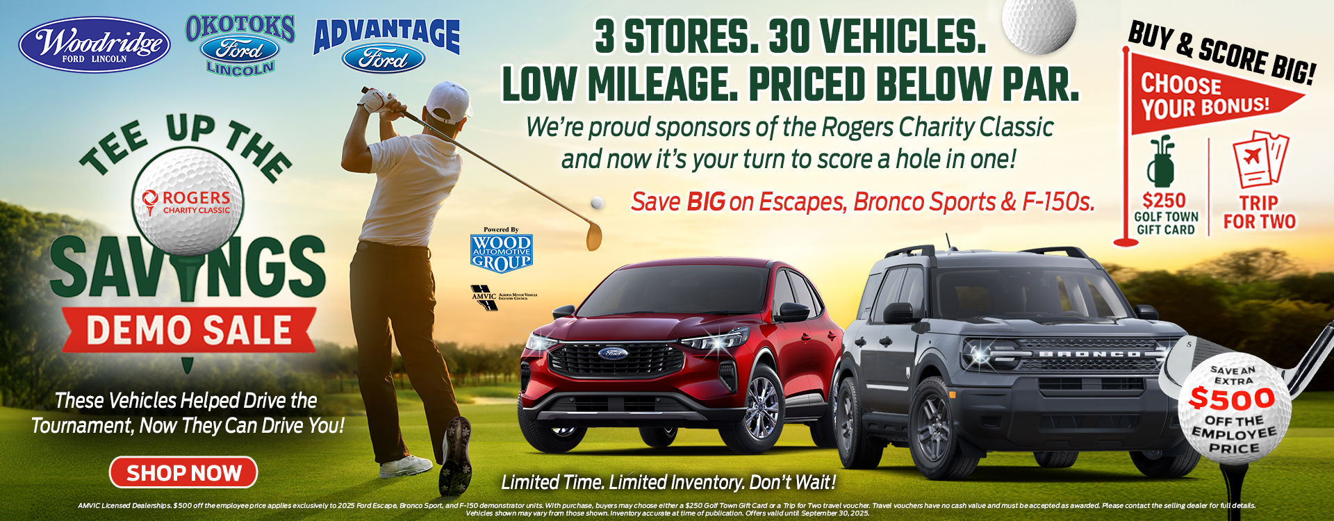 We’re proud sponsors of the Rogers Charity Classic and now it’s your turn to score a hole in one. Woodridge Ford, Advantage Ford, and Okotoks Ford are teaming up to offer 30 tournament-driven demo vehicles with incredible savings.